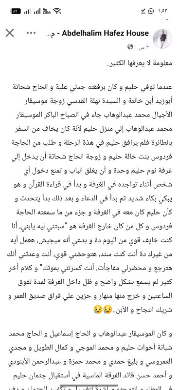 وقالت الأسرة عبر صفحته الرسمية بفيسبوك: معلومة لا يعرفها الكثير.. عندما توفي حليم وكانت برفقته جدتي علية والحاج شحاتة أبو زيد ابن خالته والسيدة نهلة القدسي زوجة موسيقار الأجيال محمد عبد الوهاب.