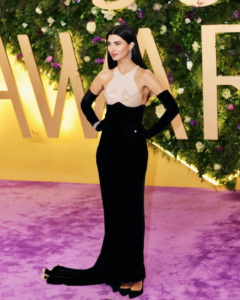 واتسم التصميم بصيحة القفازات السوداء الطويلة، وتزينت بمجموعة راقية من مجوهرات Chopard.