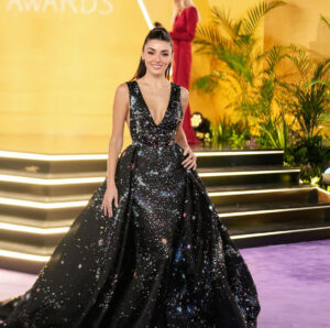 وجاء الفستان ضيقاً من الأعلى مع فتحة واسعة بقصّة V، لينسدل بلمسات حالمة بتنورة واسعة مع ذيل طويل يمتد على الأرض، في إطلالة مبهرة صنفت بين أجمل الإطلالات في الحفل لهذا العام.