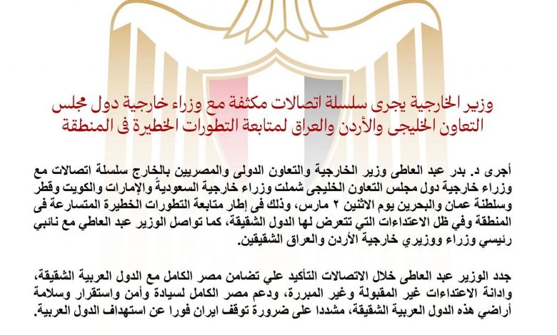 جدد الوزير عبد العاطى خلال الاتصالات التأكيد علي تضامن مصر الكامل مع الدول العربية الشقيقة، وادانة الاعتداءات غير المقبولة وغير المبررة، ودعم مصر الكامل لسيادة وأمن واستقرار وسلامة أراضي هذه الدول العربية الشقيقة، مشددا على ضرورة توقف ايران فورا عن استهداف الدول العربية.