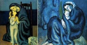 تميز بيكاسو بالبساطة والتعاطف في لوحاته، وفي هذه اللوحة تبدو الأم غارقة في عاطفتها تجاه طفلها، مما يعكس جوهر العلاقة الأمومية، كما تأثرت أعمال بيكاسو أيضاً بالفنان فينسنت فان غوخ، مما يظهر في الأسلوب التعبيري الذي استخدمه في تصوير العواطف البشرية.