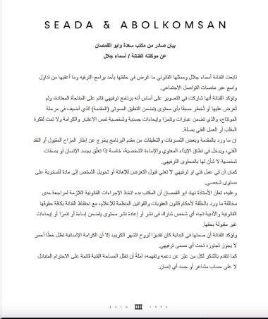 وأضافت أن مشاركة الفنانة في عمل ترفيهي لا تعني القبول بأي شكل من أشكال الإساءة أو التنمر، مشددة على أن المكتب بصدد مراجعة ما ورد بالحَلَقة قانونيًا، تمهيدًا لاتخاذ ما يلزم من إجراءات في ضوء أحكام قانون العقوبات والقوانين المنظمة للإعلام.