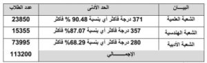– الشعبة الهندسية: 357 درجة فأكثر أي بنسبة 87.07% فأكثر.