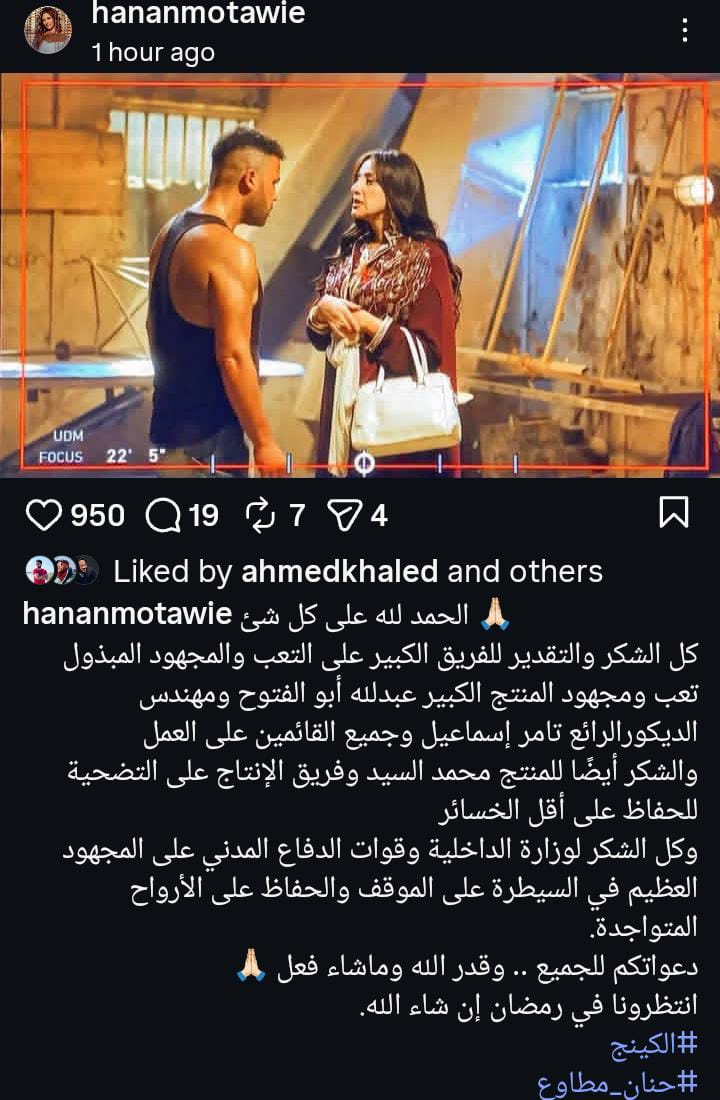 علقت قائلة: “الحمد لله على كل شيء، وكل الشكر والتقدير للفريق الكبير على التعب والمجهود المبذول؛ تعب ومجهود المنتج الكبير عبدالله أبو الفتوح، ومهندس الديكور الرائع تامر إسماعيل، وجميع القائمين على العمل.”