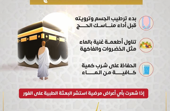 أكدت وزارة الصحة على أهمية بدء ترطيب الجسم وترويته قبل انطلاق المناسك، مشيرة إلى أن شرب كميات كافية من الماء وتناول الأطعمة الغنية بالماء مثل الخضراوات والفاكهة من أبرز وسائل الوقاية من الجفاف، خاصة في ظل ارتفاع درجات الحرارة خلال موسم الحج.