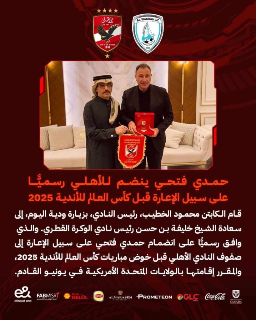 وفي بيان رسمي، أكد الأهلي أن محمود الخطيب، رئيس النادي، قام بزيارة ودية للشيخ خليفة بن حسن، رئيس نادي الوكرة القطري، الذي أبدى موافقته على إعارة حمدي فتحي للفريق الأحمر لدعم صفوفه خلال البطولة.
