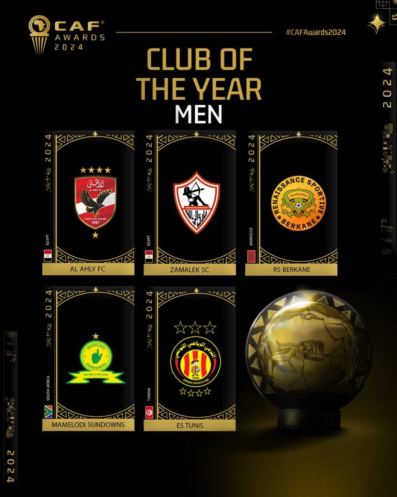 كشف الاتحاد الإفريقي لكرة القدم (كاف) عن القائمة النهائية للأندية المرشحة لجائزة أفضل نادي في إفريقيا لعام 2024، والتي تقلصت إلى 5 فرق.