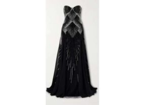 ارتدت جميلة عوض فستانا بدون أكمام، باللونين الأبيض والأسود اللامعين بأشكال هندسية، من تصميم جورج حبيقة، يصل سعره إلى 9324 دولار، أي ما يعادل 455 ألف جنيه، أي يقترب سعره للنصف مليون جنيهاً.