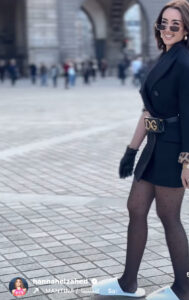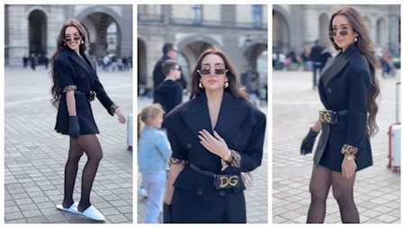 وظهرت هنا في الفيديو بإطلالة تجمع بين الأناقة والعفوية، حيث ارتدت فستانًا أسود قصيرًا، ونسقته بطريقة غير تقليدية مع “شبشب حمام”، ما أثار تفاعلًا واسعًا بين المتابعين وعدد من نجمات الفن.