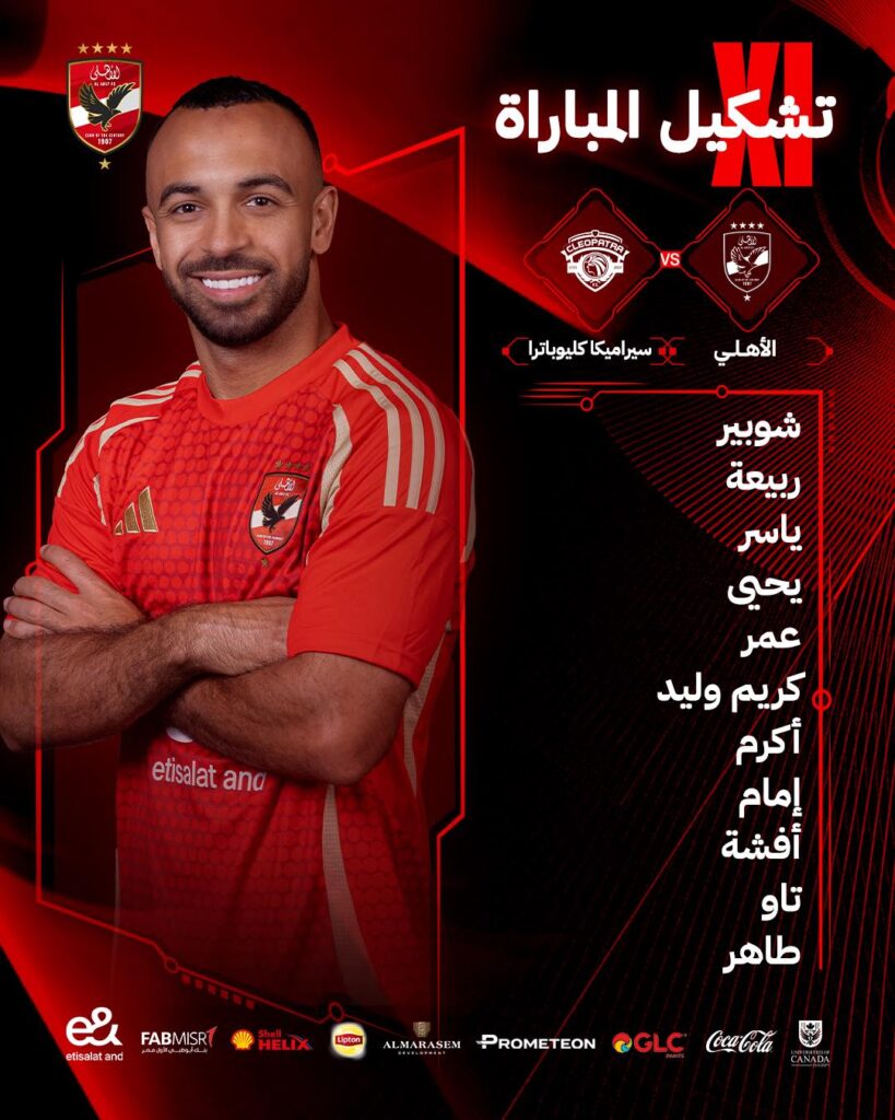 أعلن مارسيل كولر، المدير الفني للنادي الأهلي، عن تشكيل الفريق الذي سيخوض مباراته أمام سيراميكا مساء اليوم الأحد في نصف نهائي كأس السوبر المصري. المباراة ستقام على ملعب محمد بن زايد في أبو ظبي، الإمارات.