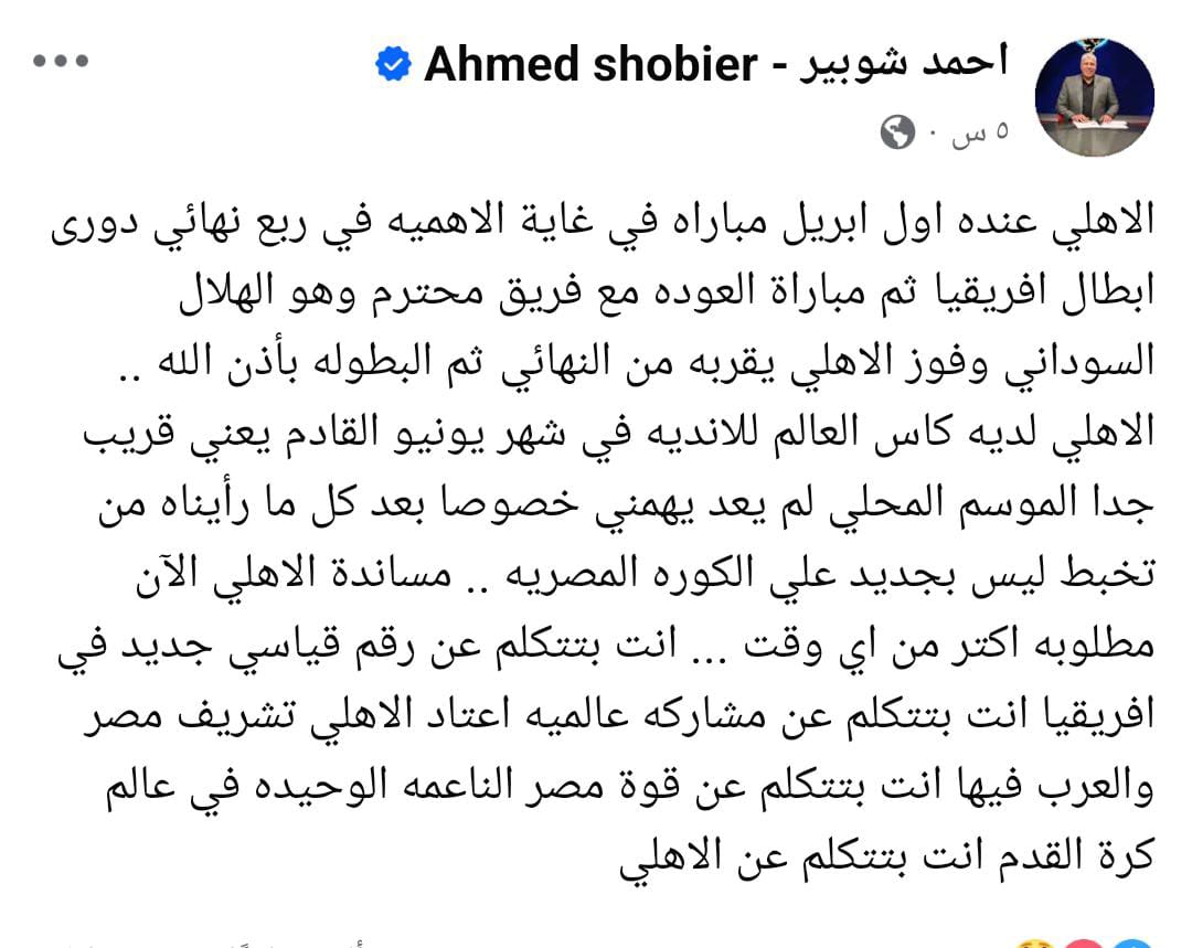 وكتب شوبير عبر حسابه الرسمي على “فيس بوك”: “الأهلي لديه مباراة مهمة في الأول من أبريل في ربع نهائي دوري أبطال إفريقيا، ثم لقاء العودة أمام الهلال السوداني، والفوز به يقربه من النهائي ثم التتويج بالبطولة بإذن الله”.