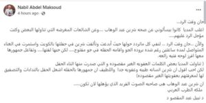 وكتب الدكتور نبيل عبد المقصود: “حان وقت الرد… أغلب الميديا كانوا بيسألوني عن صحة شيرين عبد الوهاب، وعن الشائعات المغرضة التي تناولها البعض وكنت مؤجل الرد عليهم، والآن، حان وقت الرد لنفي كل ما تردد حولها حيث أبدعت وتألقت شيرين في حفلتها بالكويت واستمرت في الغناء المتواصل لمدة ساعتين رغم شدة برودة الجو، وإقامة الحفلة جو مفتوح، لكن حبها لفنها وتفاعل جمهورها معها أفرز لوحة فنية رائعة”.