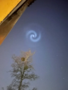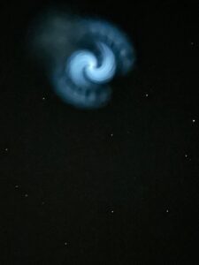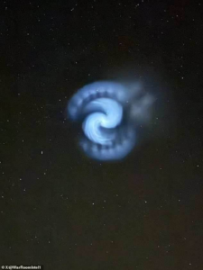 ولكن أكد بعض الخبراء بإن الشكل الغريب كان بسبب الوقود المجمد المضاء الذي تم إخراجه من صاروخ سبيس إكس، ويتشكل الشكل الحلزوني الأزرق الفاتح عندما يتحول الوقود الزائد الذي تم إطلاقه من الصاروخ سريع الدوران إلى جليد.