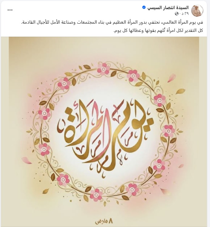 وقالت انتصار السيسي، في منشور لها عبر صفحتها الرسمية بموقع التواصل الاجتماعي «فيس بوك»: في يوم المرأة العالمي، نحتفي بدور المرأة العظيم في بناء المجتمعات وصناعة الأمل للأجيال القادمة.. كل التقدير لكل امرأة تُلهم بقوتها وعطائها كل يوم».