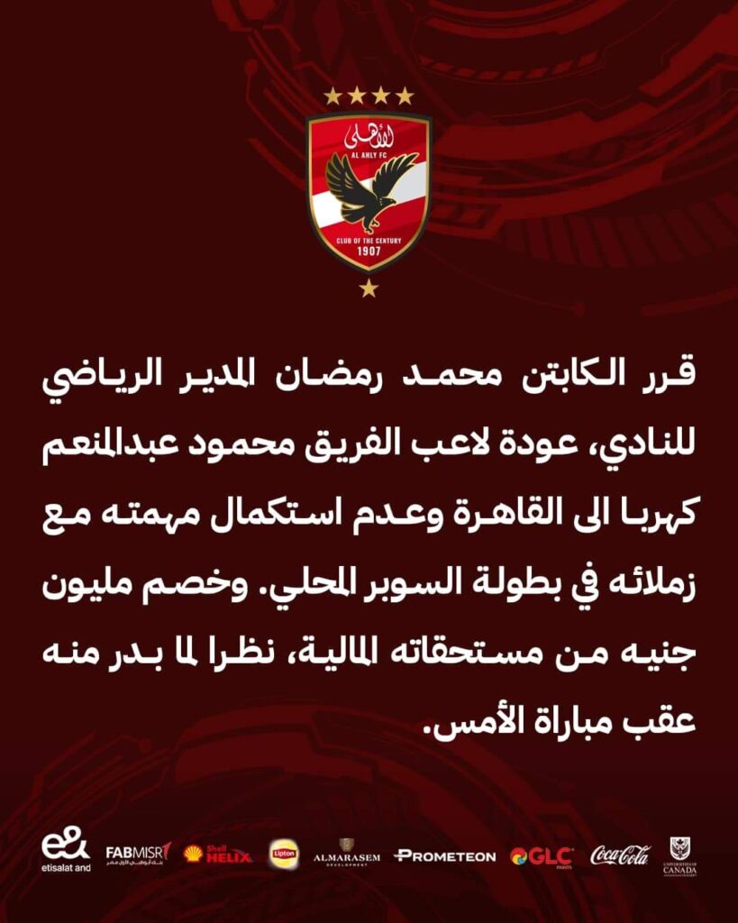 أعلن النادي الأهلي عن عودة لاعبه محمود عبد المنعم “كهربا” إلى القاهرة، مع خصم مليون جنيه من مستحقاته نتيجة تصرفاته بعد مباراة الأمس أمام سيراميكا في كأس السوبر المصري.