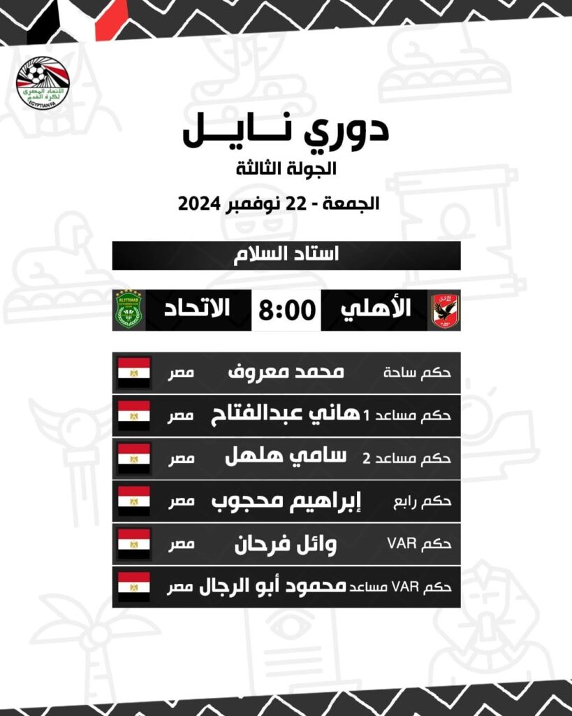 أعلنت لجنة الحكام بالاتحاد المصري لكرة القدم عن الطاقم التحكيمي الذي سيقود مباراة القمة المرتقبة بين النادي الأهلي والاتحاد السكندري ضمن منافسات الدوري المصري الممتاز.