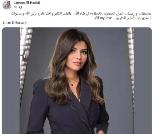 وكتبت “الحديدي”: “صديقتي وزميلتي إيمان الحصري.. تقومي بالسلامة إن شاء الله.. عانيت الكثير وأنت قادره بإذن الله وبدعوات المحبين أن تكملي الطريق”.