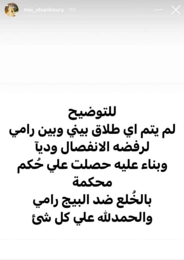 وقالت زوجة بيج رامي في منشورها: «للتوضيح، لم يتم أي طلاق بيني وبين رامي لرفضه الانفصال وديًا، وبناءً على ذلك حصلت على حكم محكمة بالخلع ضد بيج رامي. الحمد لله على كل شيء».