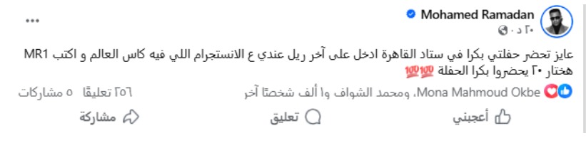 محمد رمضان يطلق مسابقة للجمهور لحضور حفله في ستاد القاهرة