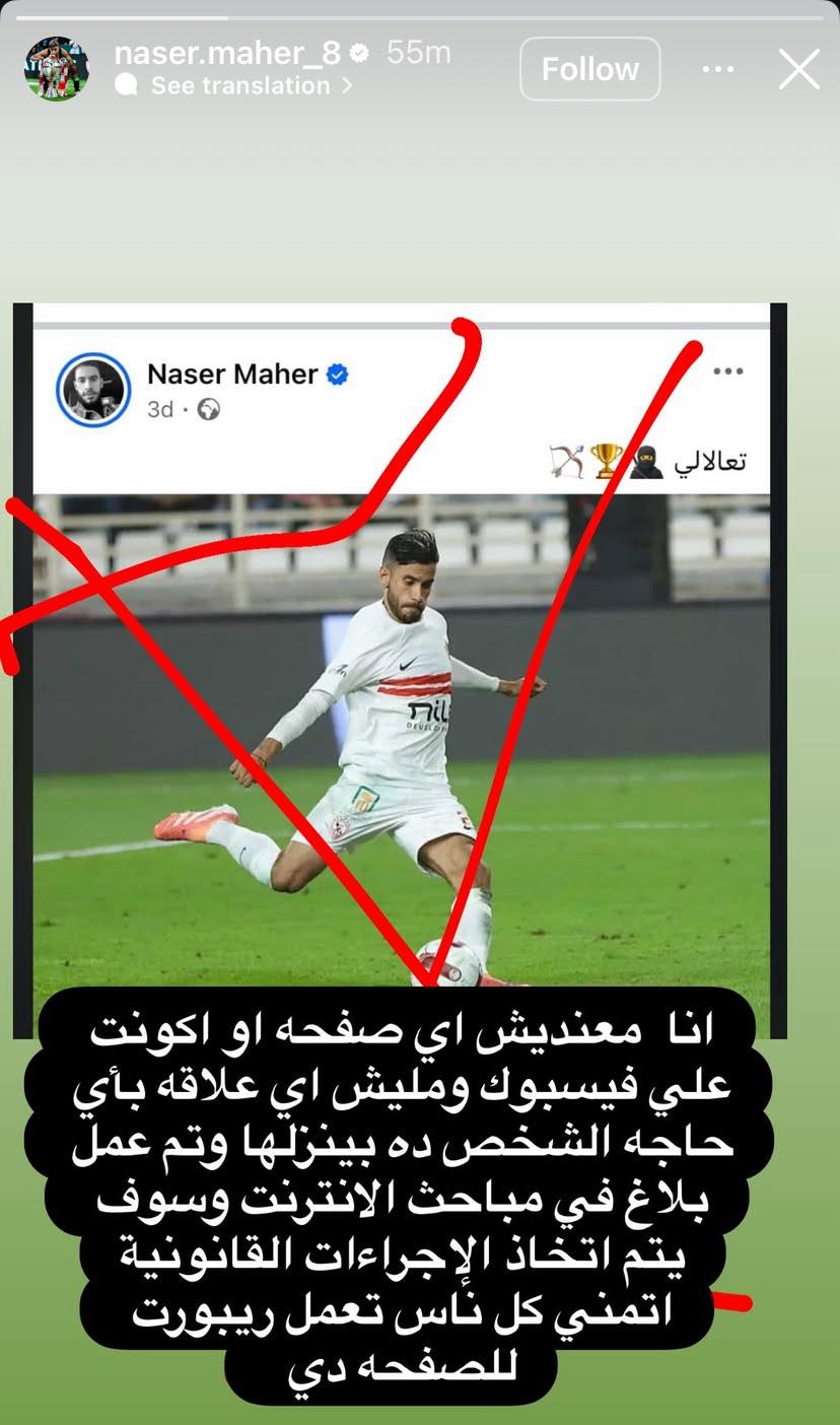 أكد ناصر ماهر، لاعب نادي الزمالك، أنه لا يمتلك أي صفحة على موقع فيسبوك، موضحًا عبر حسابه الرسمي على إنستجرام أن الصفحة التي تحمل اسمه على المنصة لا تخصه ولا تعبر عنه.