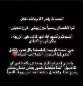 وحرص “غزلان” على مشاركت جمهوره خبر طلاقه، إذ قام بنشر ستوري عبر موقع تبادل الصور الشهير “إنستجرام”، وكنب: ” الحمد لله وقدر الله وما شاء فعل، تم الانفصال رسميا مع زوجتي فرح شعبان”.