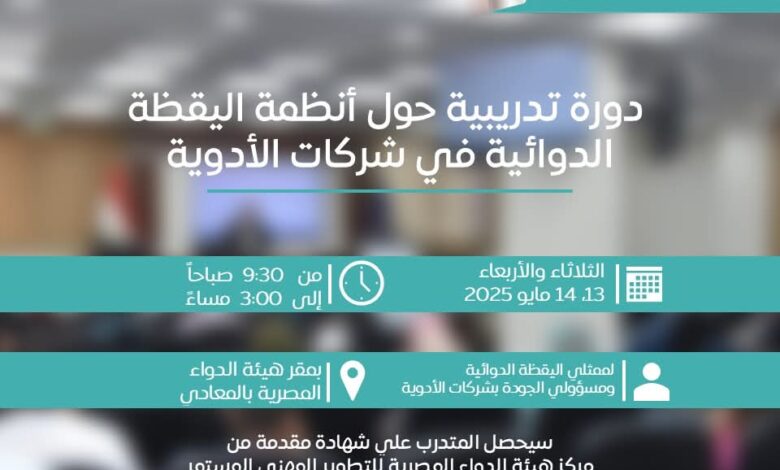 ومن المقرر إقامة الدورة يومي الثلاثاء والأربعاء الموافقين 13 و14 مايو 2025، بمقر هيئة الدواء المصرية في المعادي، على أن تبدأ الفعاليات من التاسعة والنصف صباحًا وحتى الثالثة عصرًا.
