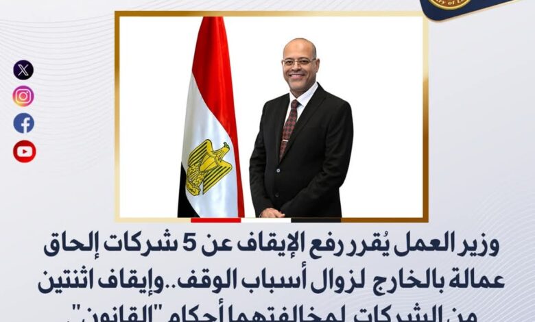 أكد وزير العمل، محمد جبران، اليوم الإثنين، رفع الإيقاف عن خمس شركات متخصصة في إلحاق العمالة المصرية بالخارج، بعد زوال الأسباب التي أدت إلى إيقافها.