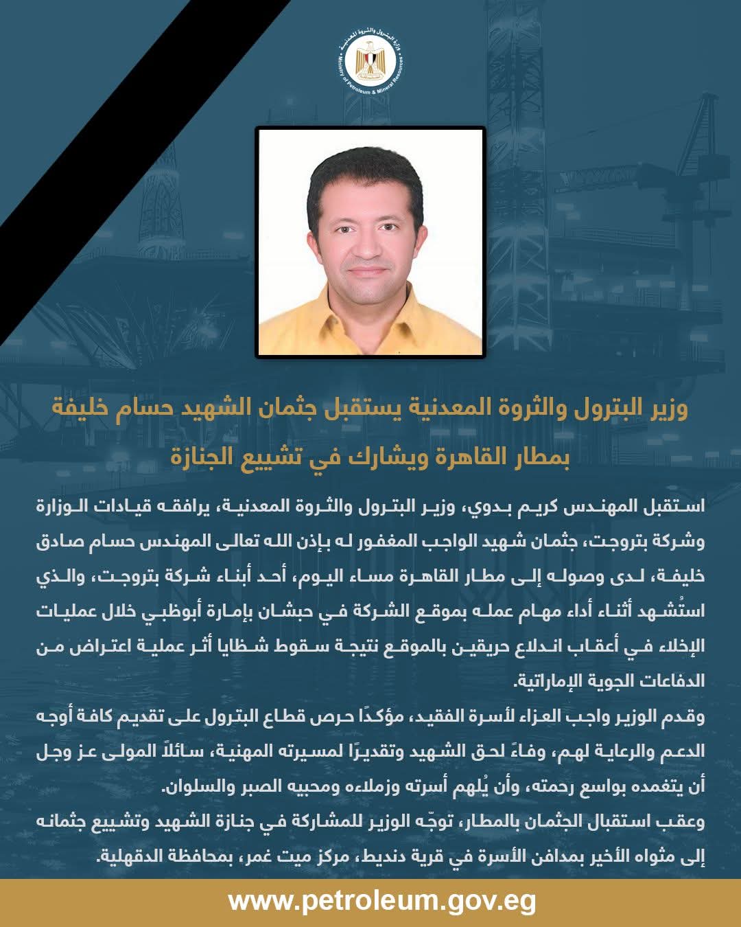 استقبل المهندس كريم بدوي، وزير البترول والثروة المعدنية، يرافقه قيادات الوزارة وشركة بتروجت، جثمان شهيد الواجب المغفور له بإذن الله تعالى المهندس حسام صادق خليفة، لدى وصوله إلى مطار القاهرة مساء اليوم، أحد أبناء شركة بتروجت، والذي استُشهد أثناء أداء مهام عمله بموقع الشركة في حبشان بإمارة أبوظبي خلال عمليات الإخلاء في أعقاب اندلاع حريقين بالموقع نتيجة سقوط شظايا أثر عملية اعتراض من الدفاعات الجوية الإماراتية.
