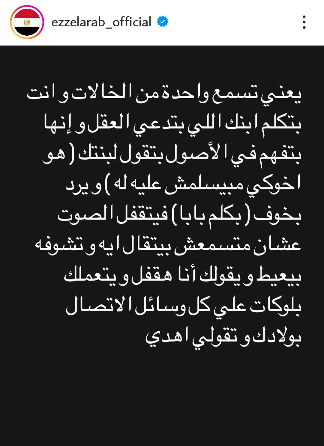 وكتب محمد عز العرب، خلال حسابه الشخصي بموقع تبادل الصور والفيديوهات “إنستجرام”: “يعني تسمع واحدة من الخالات وأنت بتكلم ابنك اللي بتدعي العقل وإنها بتفهم في الأصول”.