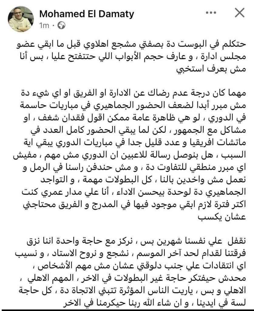 وجه محمد الدماطي عضو مجلس إدارة الأهلي، رسالة إلى الجماهير، تحدث خلالها بصفته مشجعًا للنادي قبل كونه عضوًا في مجلس الإدارة، مؤكدًا أهمية التواجد الجماهيري في المرحلة الحالية من الموسم.