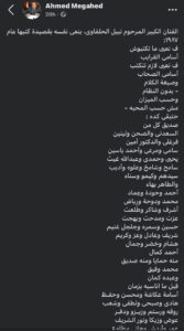 تضمنت القصيدة التي نشرها، دعوة من الحلفاوي لعائلته من أجل عدم ذكر أسماء الأقرباء في ورقة نعيه، بل الأصدقاء، معدداً عشرات الأسماء.